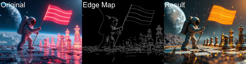 Flux Canny uses an edge map and also lets you prompt freely. Itβs especially good for repurposing parts of an image like the planet in the first example.