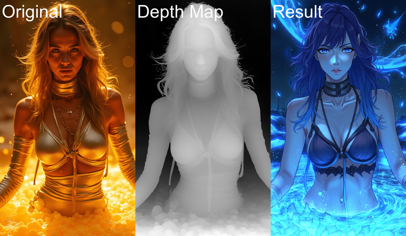Flux Depth uses the depth map of an image, letting you prompt for what to fill it with. It's great for keeping the spatial layout while restyling the image however you want.
