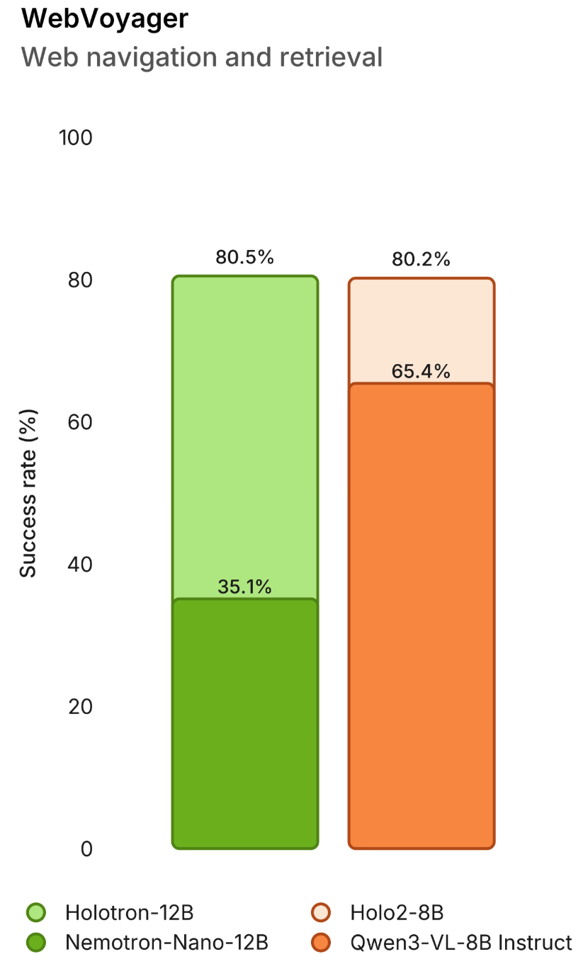 On computer-use and navigation benchmarks, Holotron-12B shows strong improvements over the Nemotron base model and strong performance with established agent models. Its WebVoyager performance increased from 35.1% to 80.5%, exceeding Holo2-8B’s performance on the benchmark and illustrating the model’s ability to perform effectively in an agentic setting.