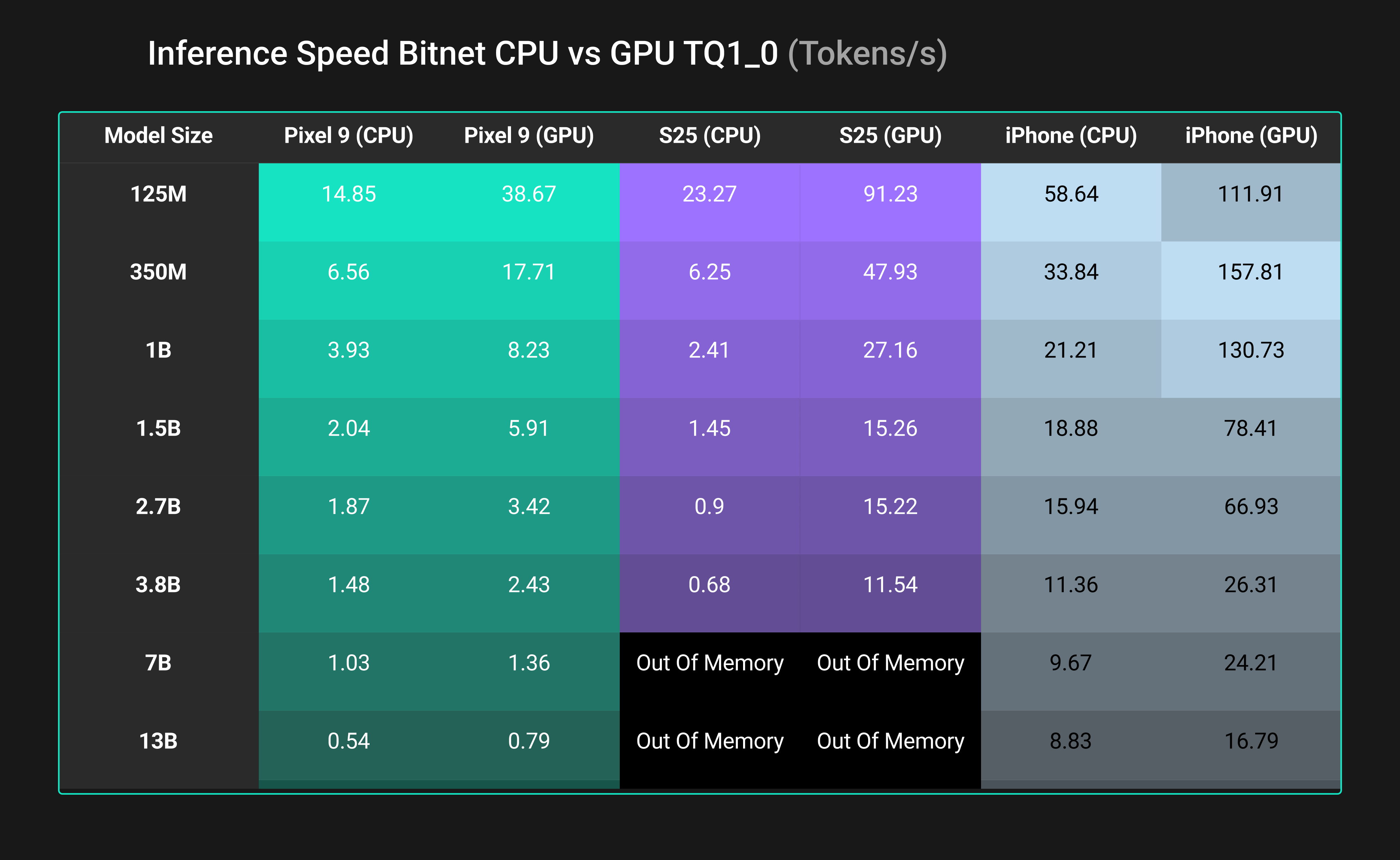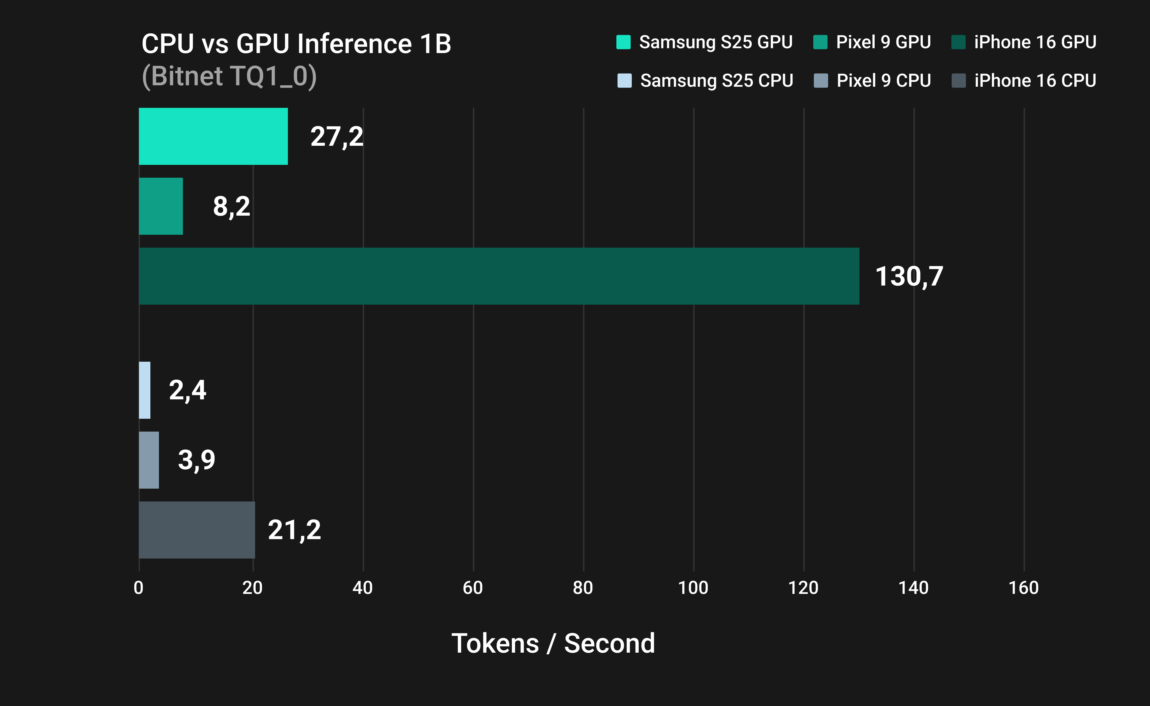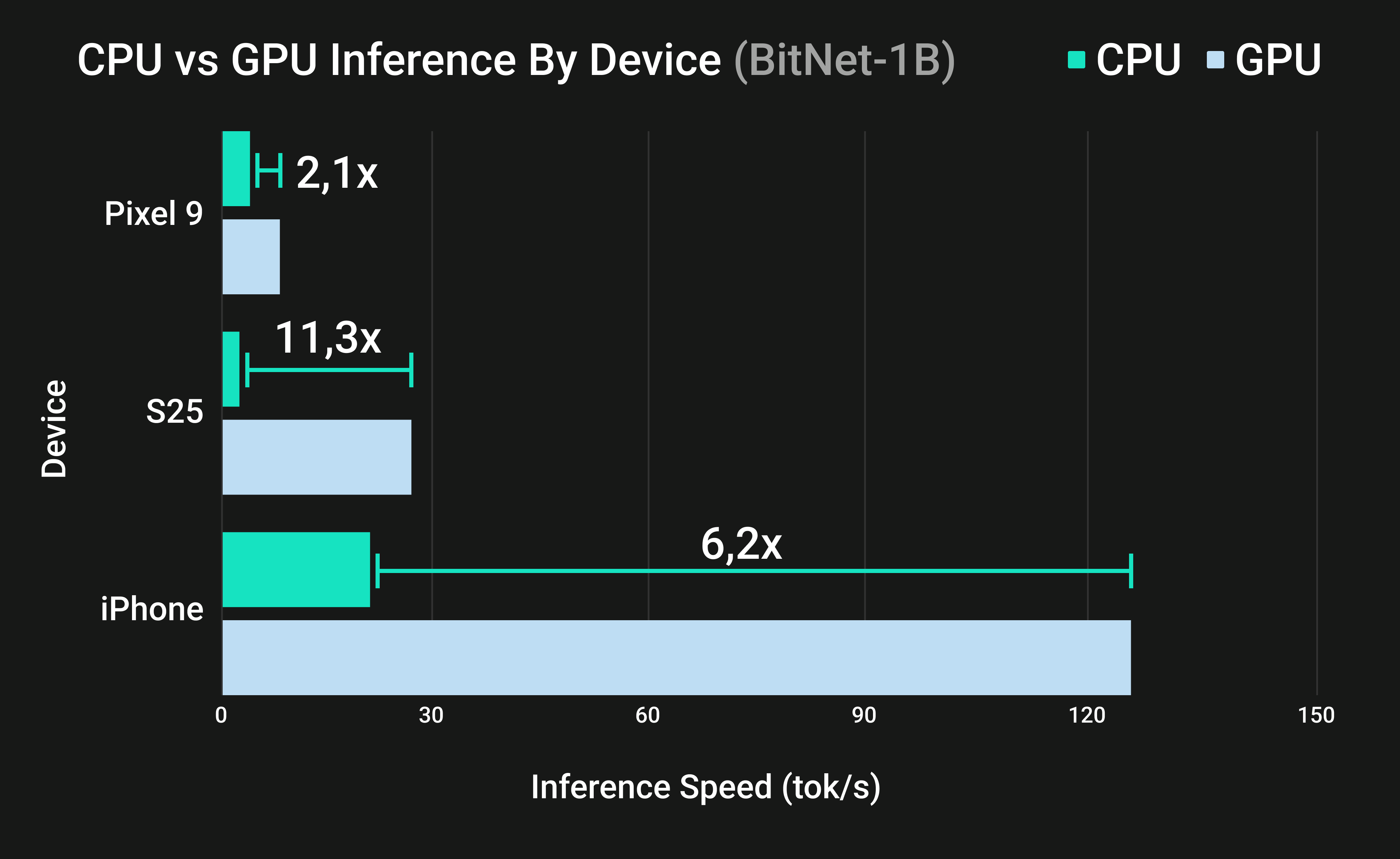 It was also demonsrated that inference of a Bitnet model is significantly faster, ranging from 2.1 to 11.3 times, on edge GPUs compared to CPUs across leading flagship devices, including the Samsung S25, Google Pixel 9, and iPhone 16.