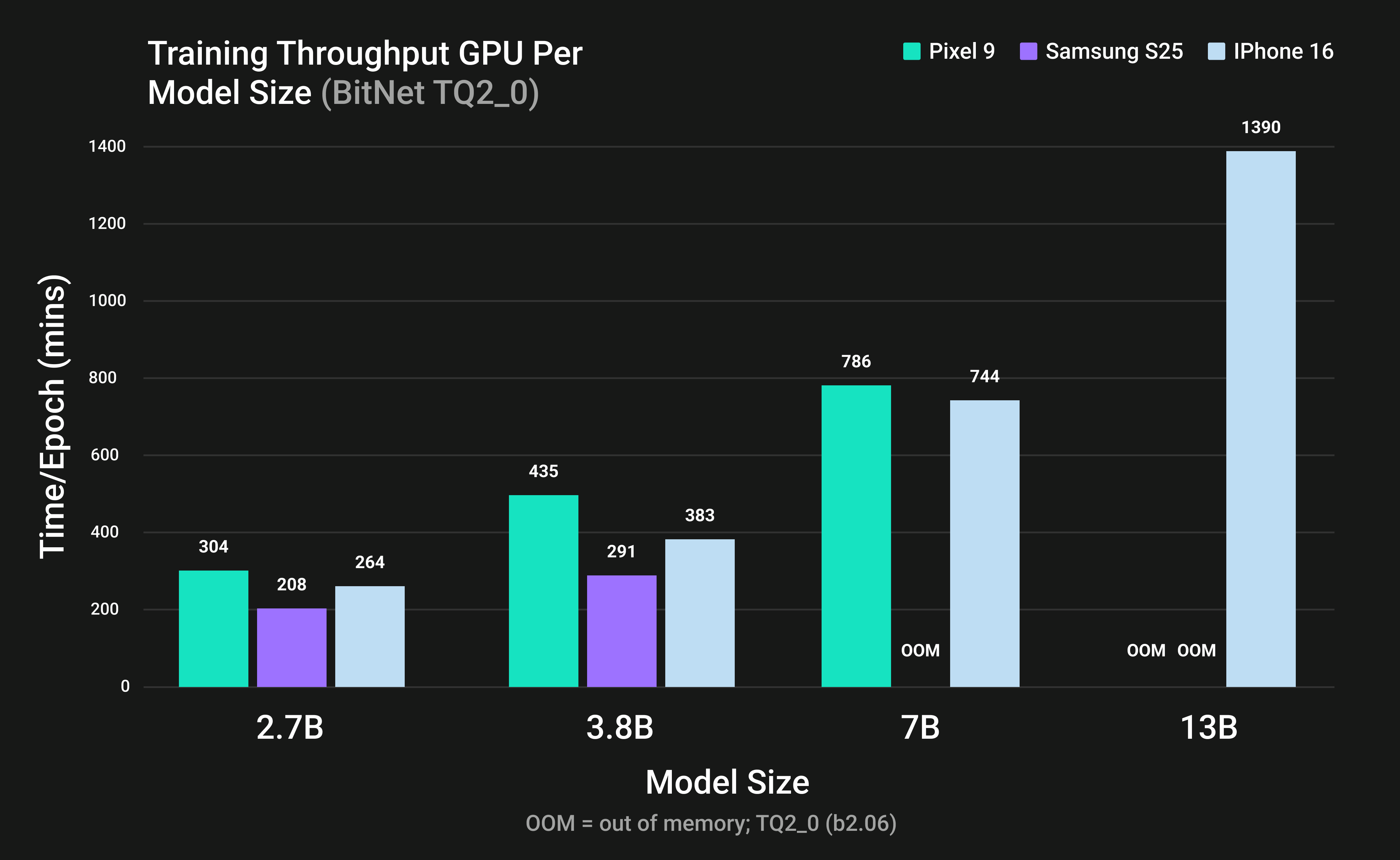 This marks the first successful demonstration of BitNet fine-tuning on mobile GPUs (Adreno, Mali, Apple Bionic GPU). Users can fine-tune 125M-parameter BitNet models in ~10 minutes on a Samsung S25. For 1B model, fine-tuning ~300 documents (~18k tokens) completes in 1 hour 18 mins on the Samsung S25 (Adreno GPU) and 1 hour 45 minutes on the iPhone 16. Pushing the devices to their limit, our team was able to finetune models up to 13B on the iPhone 16.