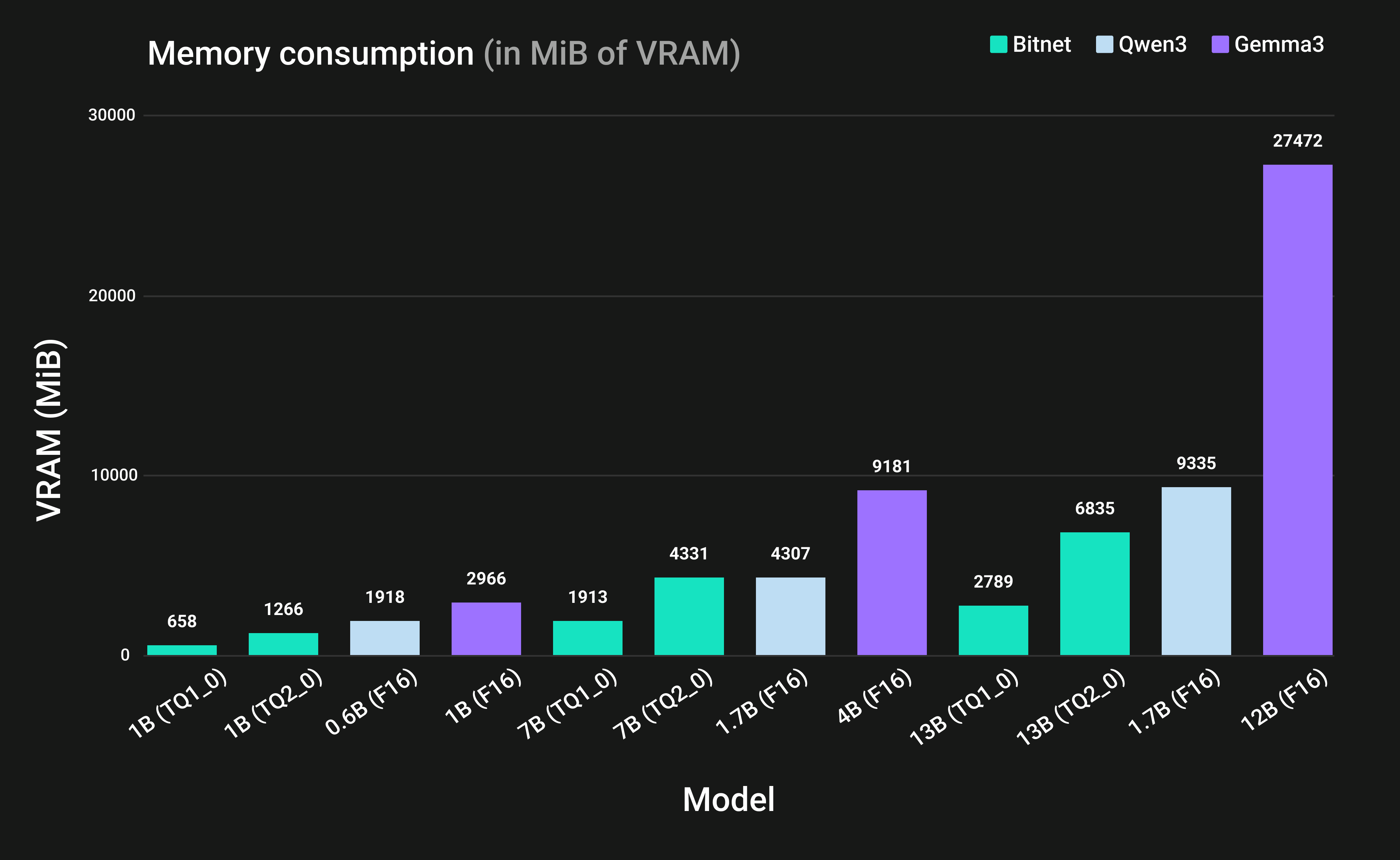 The BitNet 1B model in the TQ1_0 format requires approximately 614 MiB of VRAM, less than half of the 1,536 MiB required by the smaller Qwen3-0.6B model in FP16. At larger scales, the BitNet-2.7B model uses only 1,228 MiB, yielding a memory footprint nearly 3.5 times smaller than the Qwen3-1.7B model, which requires 4,403 MiB. These results demonstrate that, for small to mid-sized deployments, ternary architectures enable equivalent reasoning capabilities within the same hardware constraints that previously limited models to sub-billion parameter sizes on memory-constrained devices.