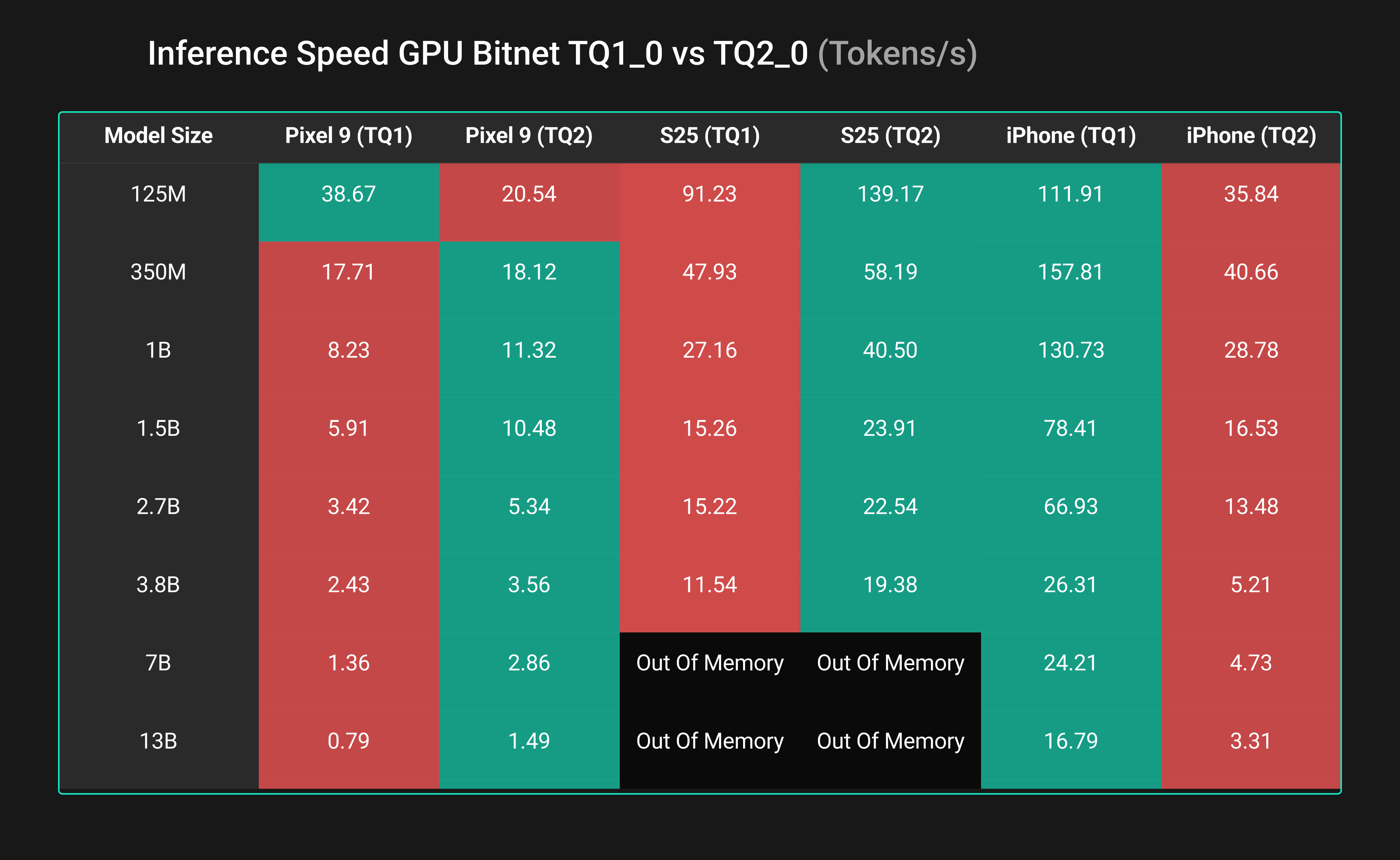 With the default CPU-based llama.cpp implementation, TQ2_0 quantization was generally expected to be faster than TQ1_0. However, our Vulkan-based GPU backend flips this trend; we observed TQ1_0 being comparable to TQ2_0 (but a bit slower) on mobile GPUs in most cases and significantly faster than TQ2_0 for iPhone 16. The key advantage of TQ1_0 is its smaller memory footprint, enabling larger models to run on smartphones. For example, at 1B, TQ1_0 uses ~600 MB, and TQ2_0 ~1.3 GB.
