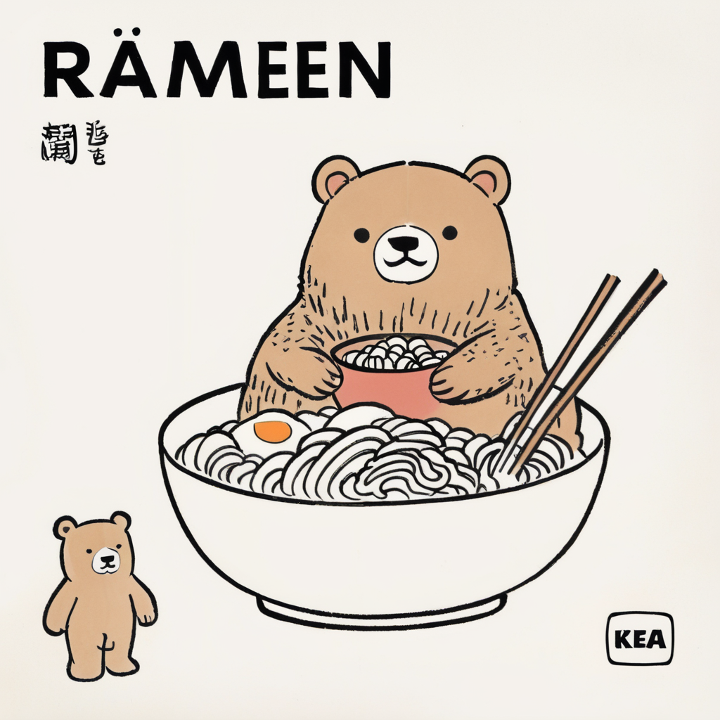pipeline("A bowl of ramen shaped like a cute kawaii bear, by Feng Zikai", cross_attention_kwargs={"scale": 1.0}).images[0]