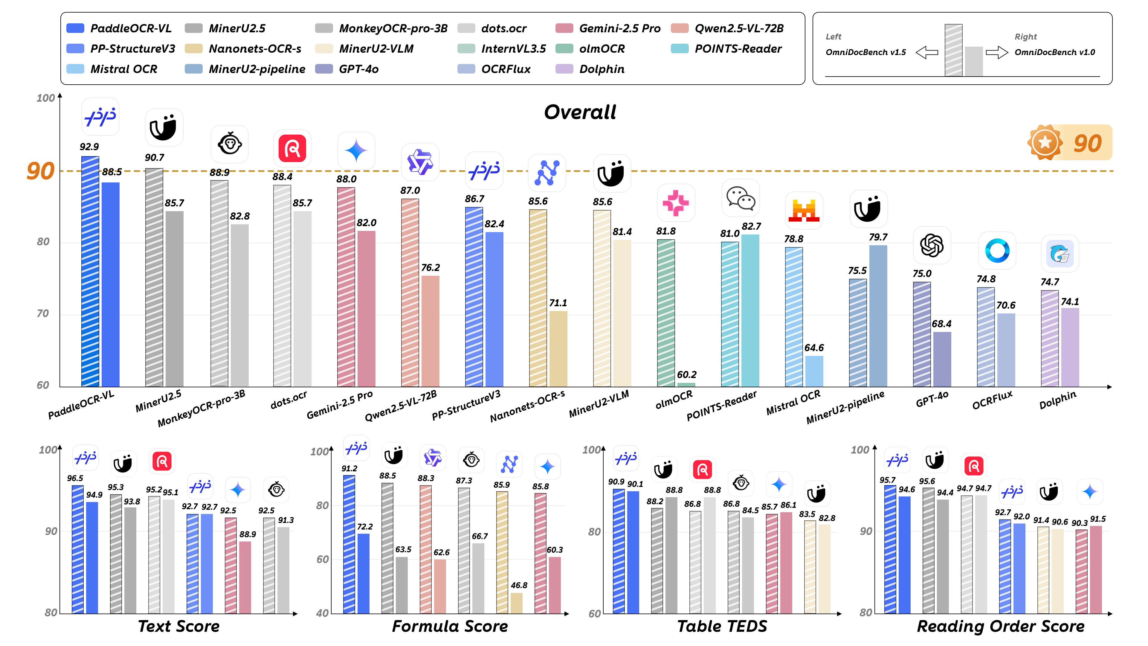 SOTA Performance on Document Parsing: PaddleOCR-VL achieves state-of-the-art performance in both page-level document parsing and element-level recognition. It significantly outperforms existing pipeline-based solutions and exhibiting strong competitiveness against leading vision-language models (VLMs) in document parsing. Moreover, it excels in recognizing complex document elements, such as text, tables, formulas, and charts, making it suitable for a wide range of challenging content types, including handwritten text and historical documents. This makes it highly versatile and suitable for a wide range of document types and scenarios.