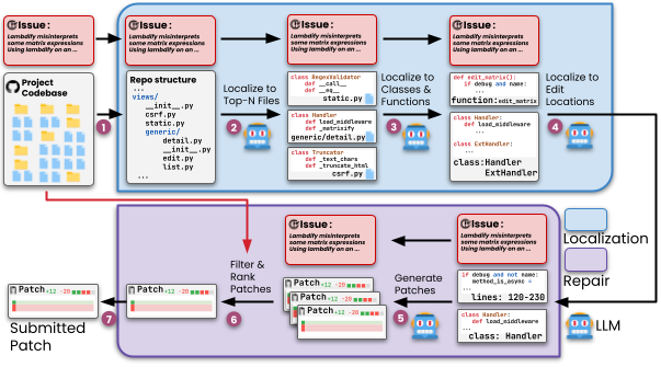 - In the localization phase, it hierarchically narrows down to suspicious files, classes/functions, and specific edit locations.