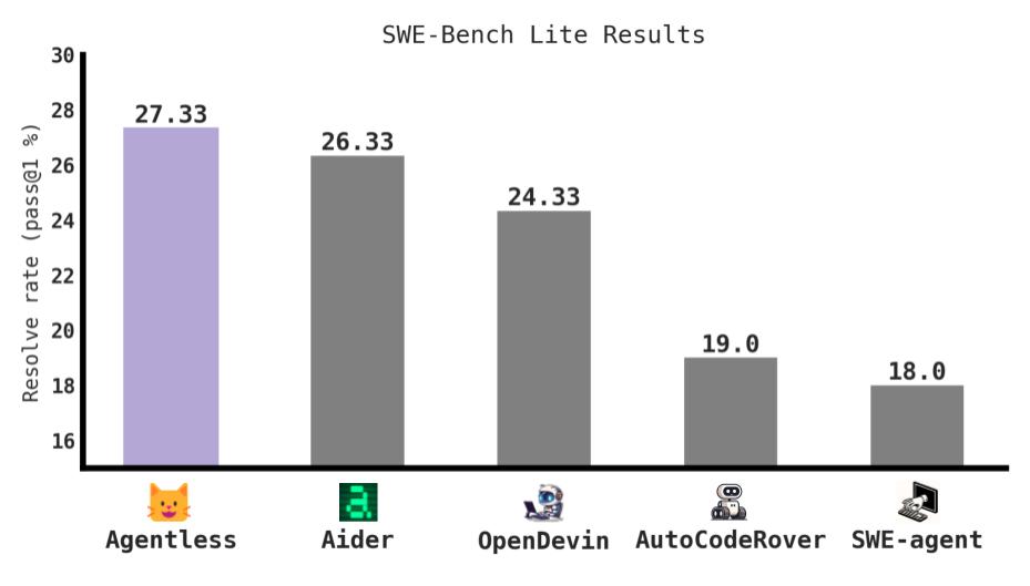- AGENTLESS achieved the highest performance (27.33% issues resolved) among open-source approaches on the SWE-bench Lite benchmark.